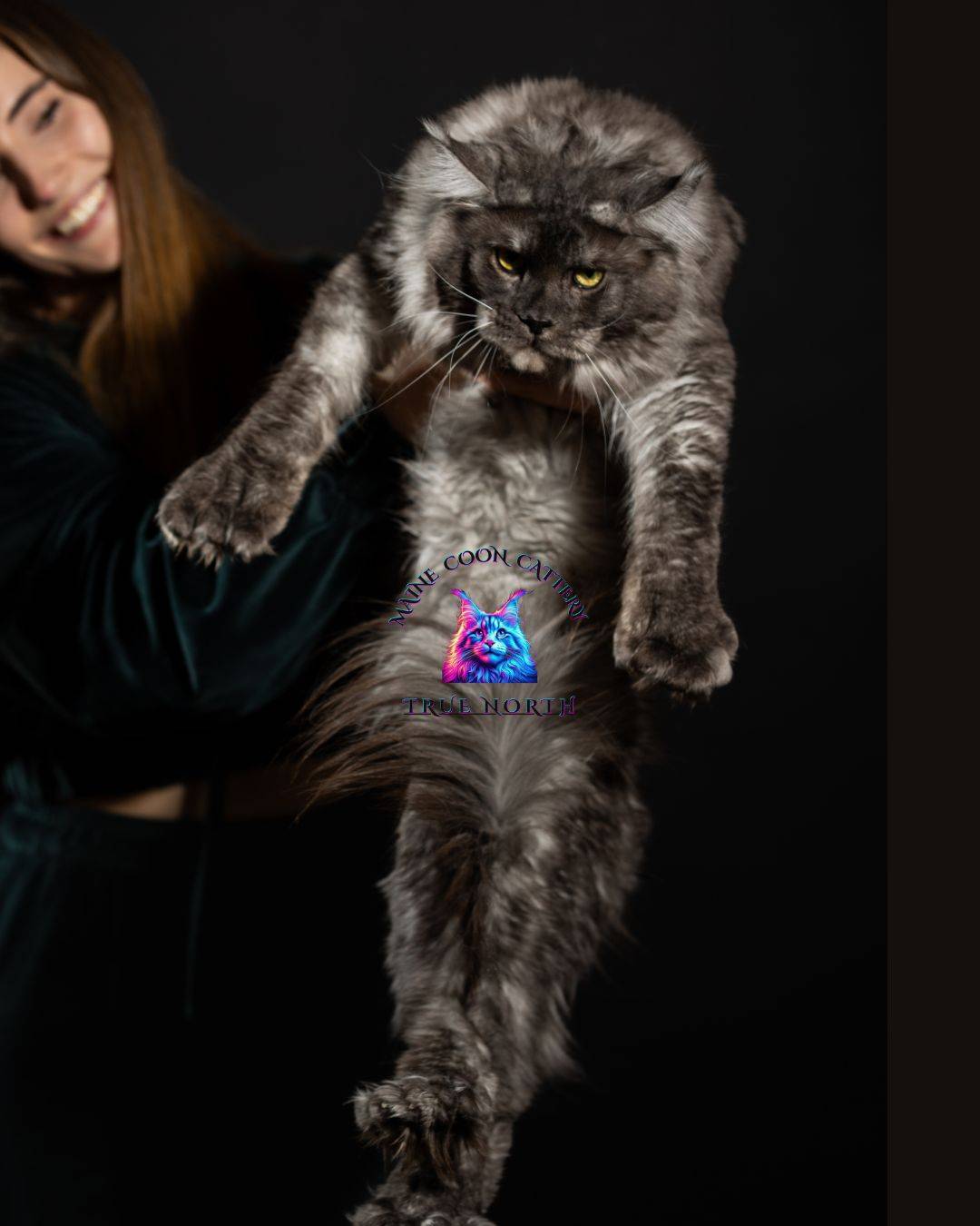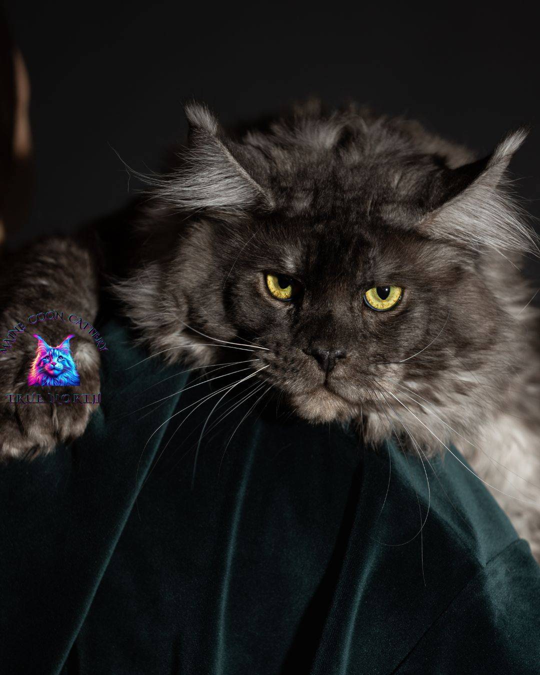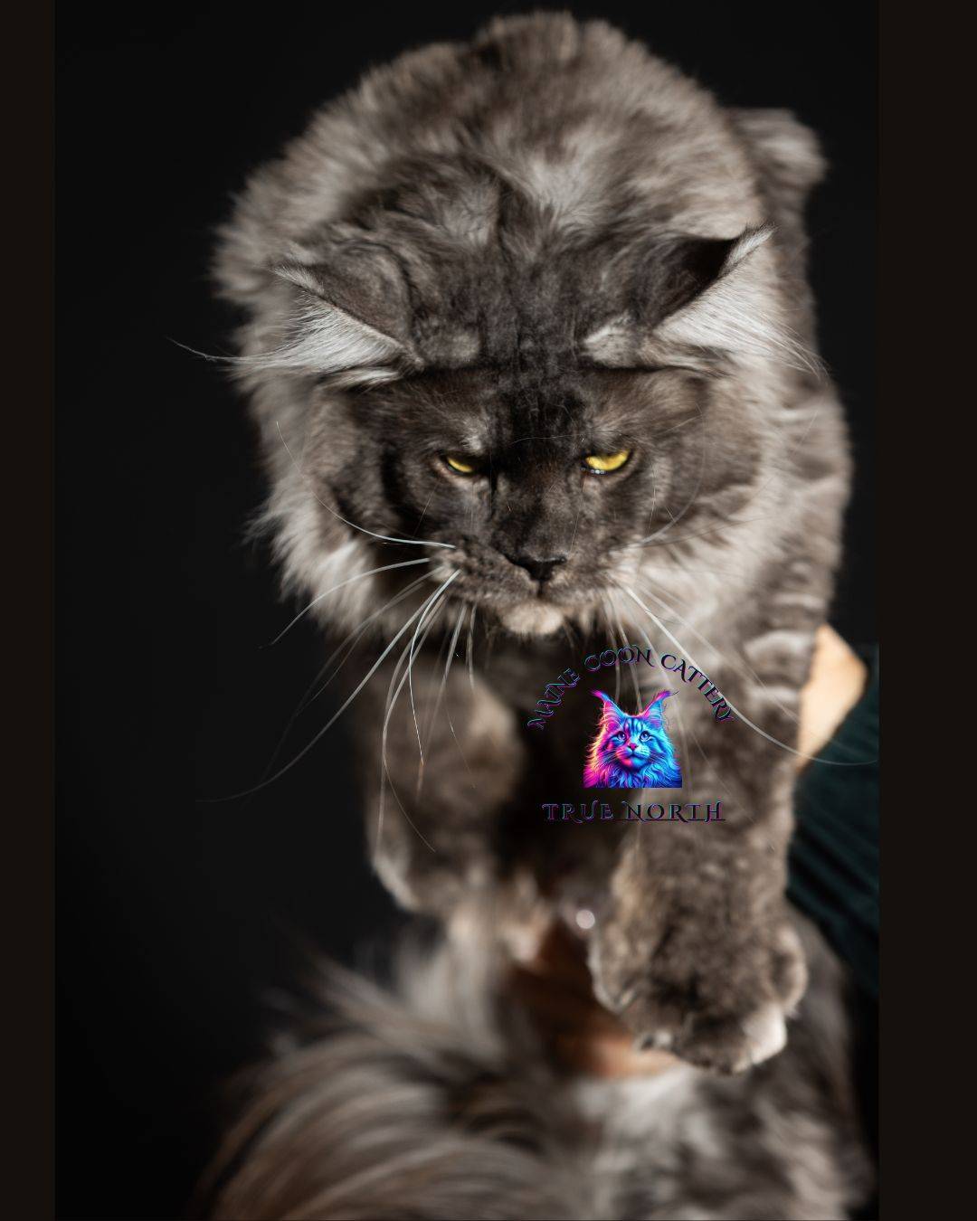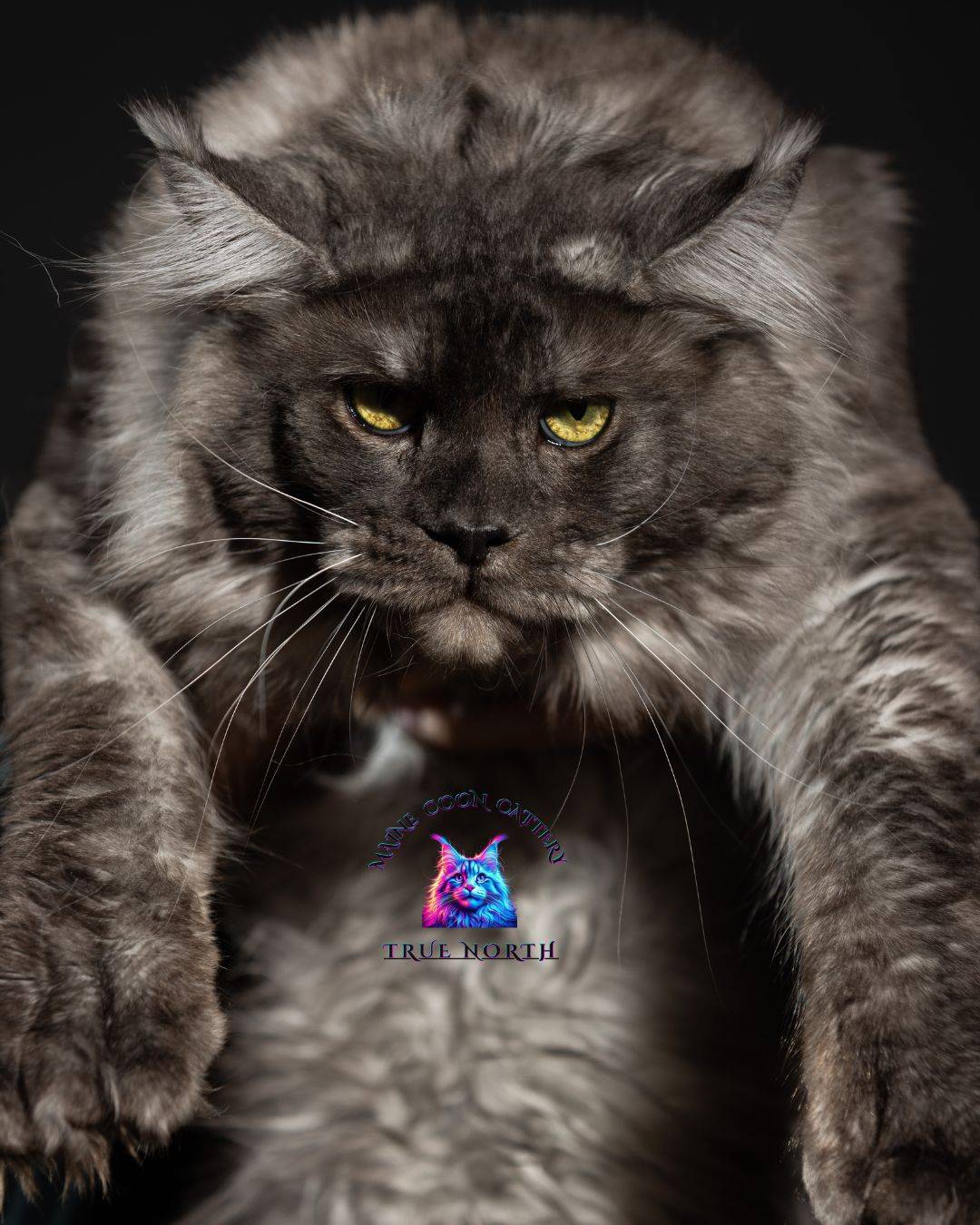 Buron is a striking black smoke Maine Coon with a truly unforgettable presence. His intense golden eyes, dramatic smoke coat, and massive structure make him very impressive stud.