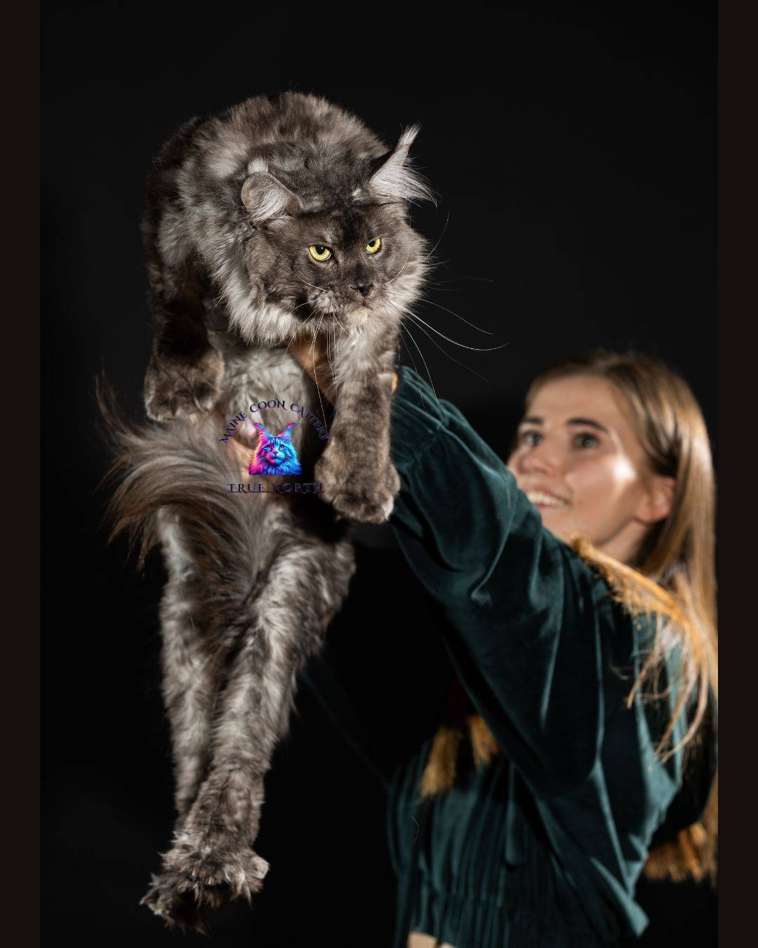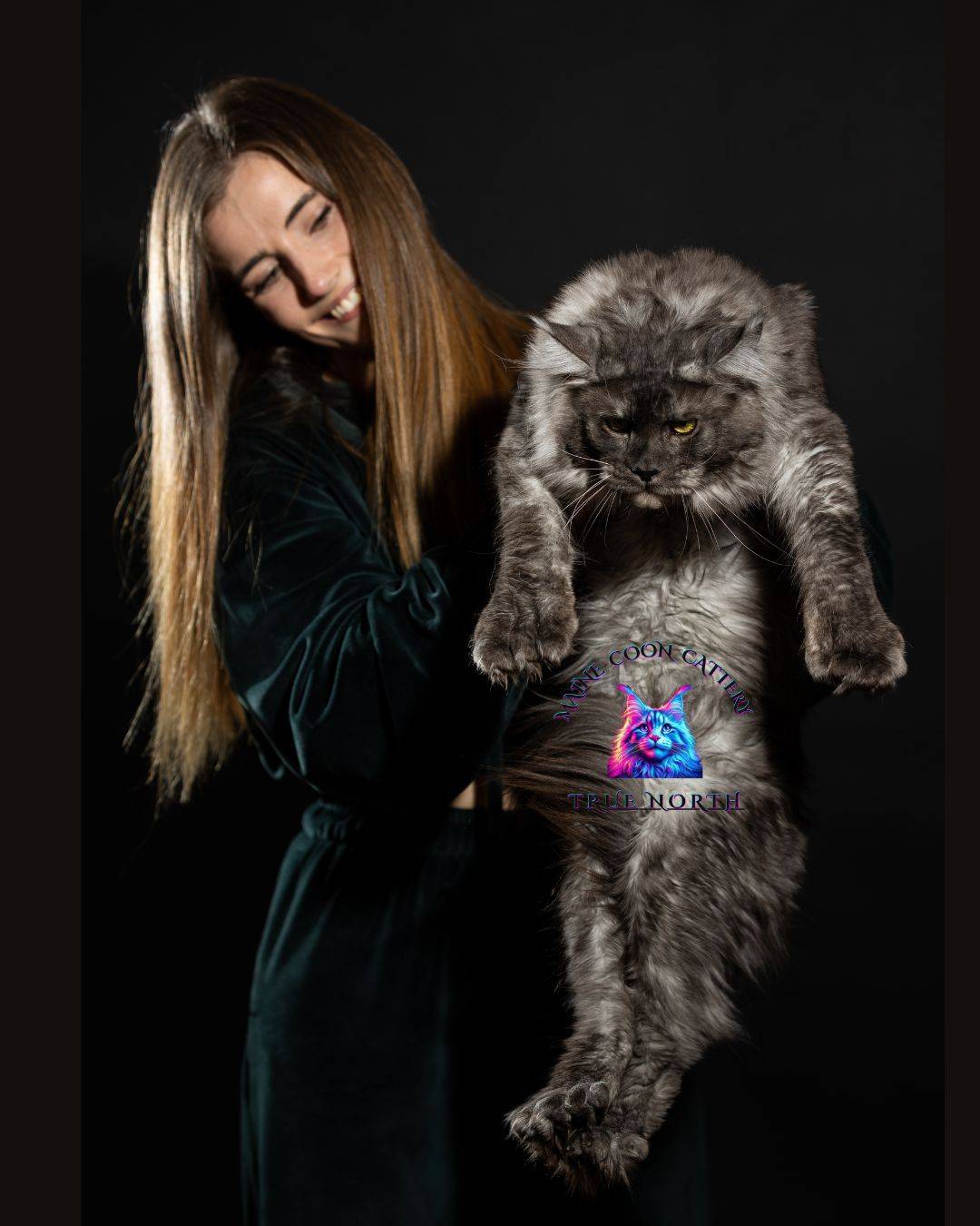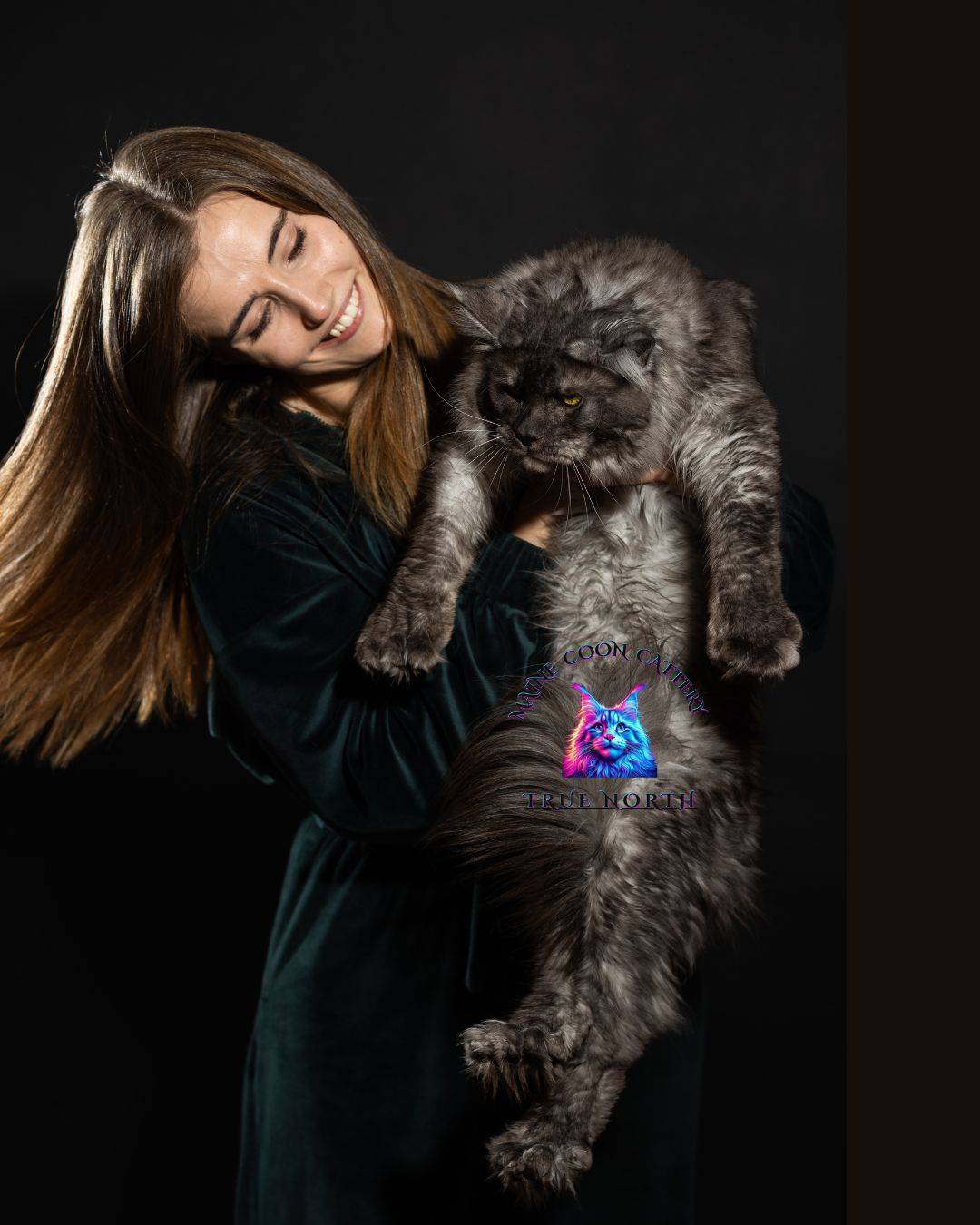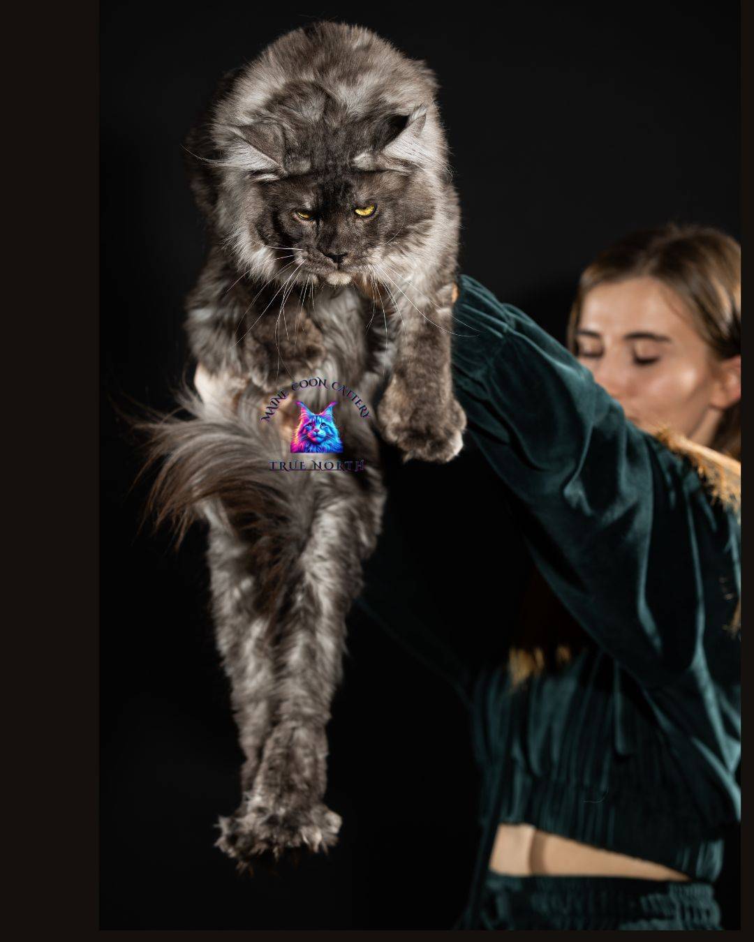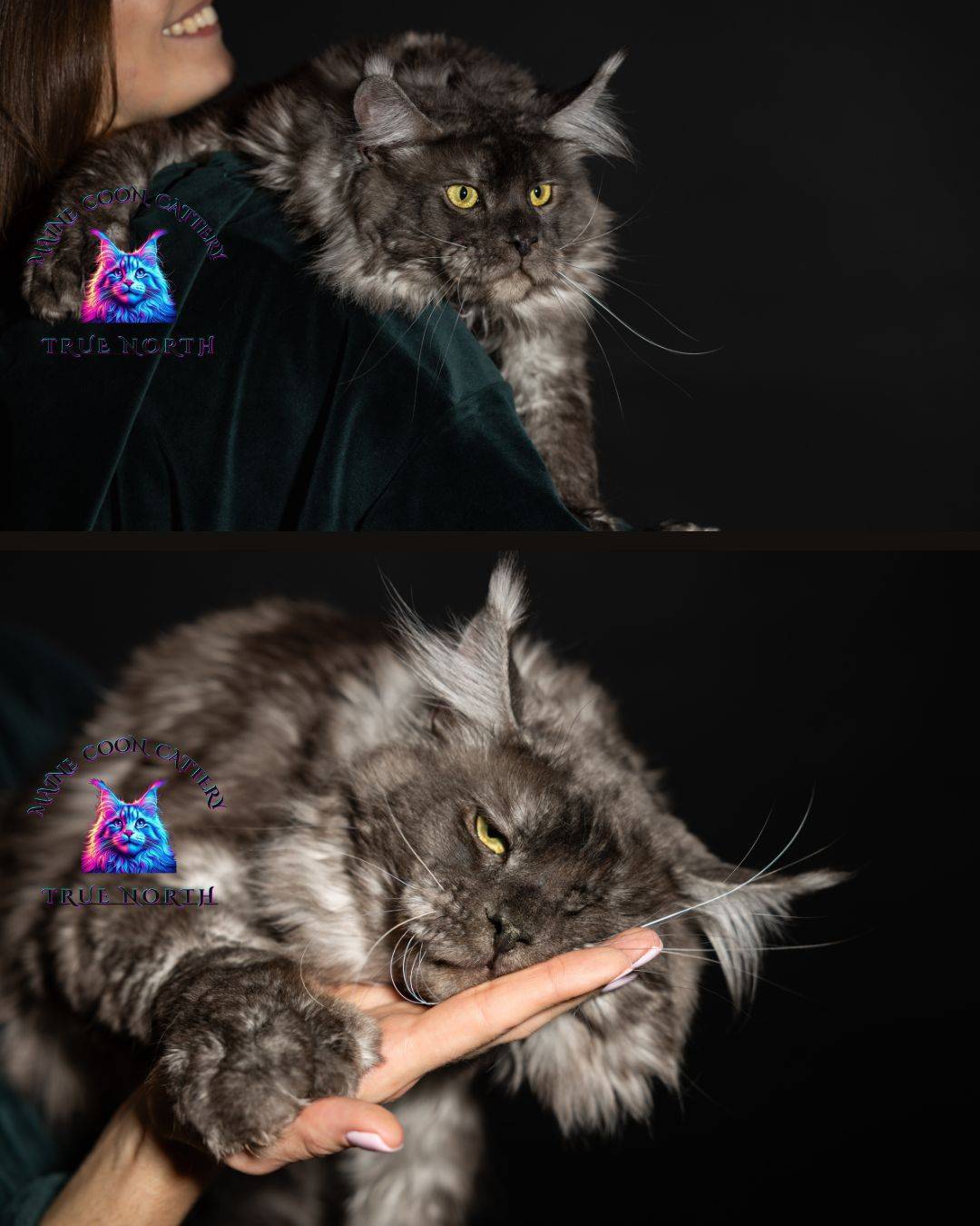 Buron is a striking black smoke Maine Coon with a truly unforgettable presence. His intense golden eyes, dramatic smoke coat, and massive structure make him very impressive stud.