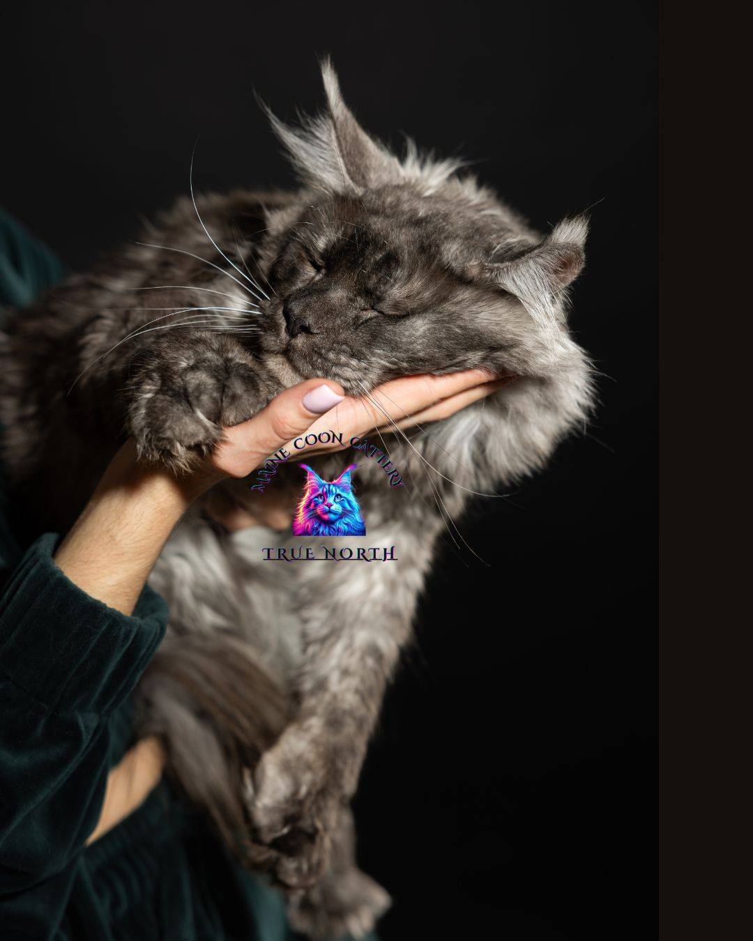 Despite his bold, fierce look, Buron has a calm, steady temperament and enjoys being close to people. His unique features — the powerful muzzle, strong profile, rich smoke coloring, and his extra toes — are all traits he proudly passes down to his kittens.